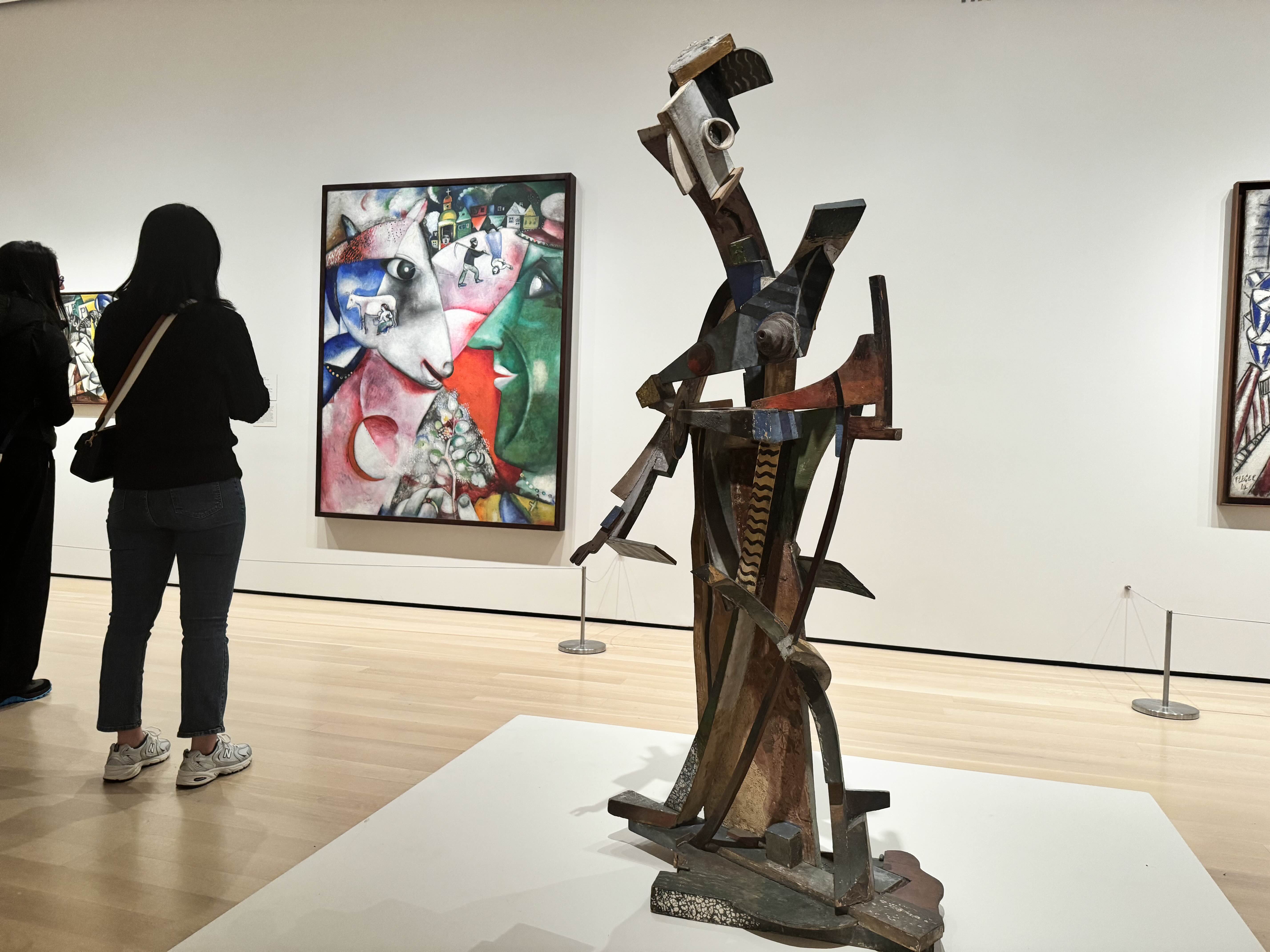 작가를 알 수 없는 입체파로 추정되는 조각 뒤에 누구나 알고 있는 미술책에 항상 등장하는 초현실주의 작가 마르크 샤갈의 I and the Village (1911)