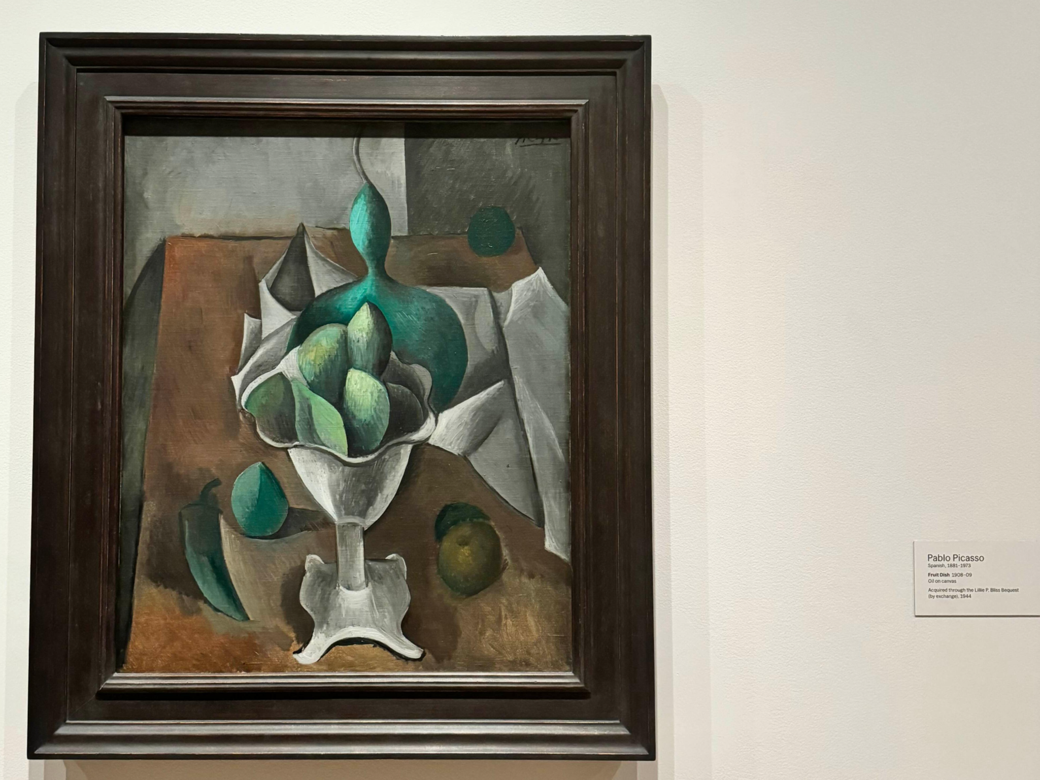 과일 접시(1908-09)라는 정물로 세잔의 영향을 받아 입체파로 가는 과도기의 작품이다. 높은 받침대 위의 과일 접시에 청록색의 배, 레몬이 기하학적으로 단순화되었지만 아직, 완전히 분해되지 않아 형태를 알아볼 수는 있다.